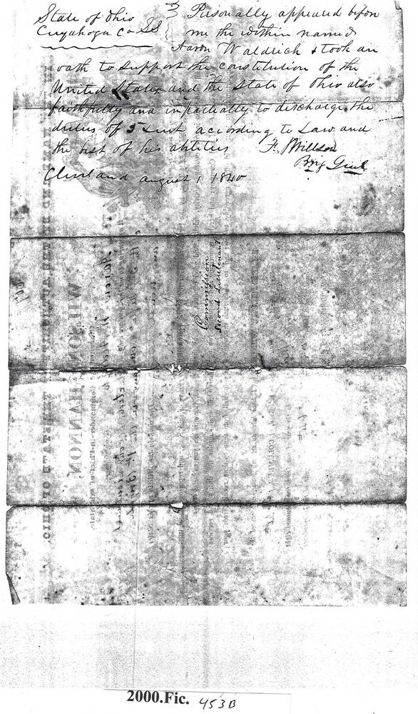 Document Details (Click image to view full size.) Participant Info COLLECTION Aldrich Family Collection CONDITION Good OBJECT_NUMB 2000.FIC.453B OBJECT Commission TITLE REverse side of commissioning document for Aaron Aldrich. IMAGE